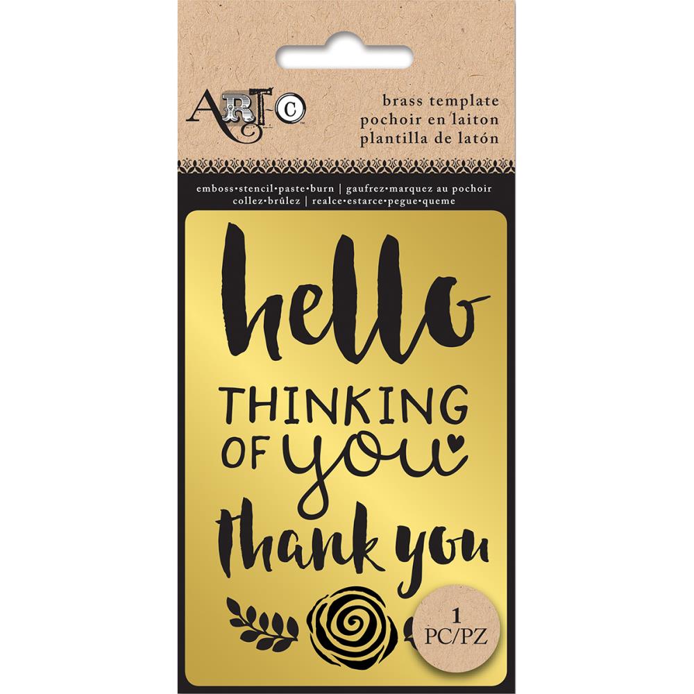 Thinking Of You brass embossing template from Momenta Art C. Template measures about 3-7/8x2-5/8 inches. Includes hello, thinking of you, thank you and flower.