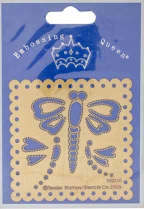 Embossing Queen brass embossing template from Tessler Stamps. Dragonflies template measures about 3"X 3".