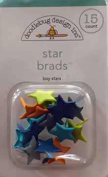 Star Shaped Brads from Doodlebug Design. Each package includes 15 star brads in assorted colors.