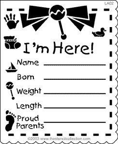 I'm Here Baby Motifs brass embossing template from The Stencil Collection. Template measures about 4-1/8" X 3-3/8".